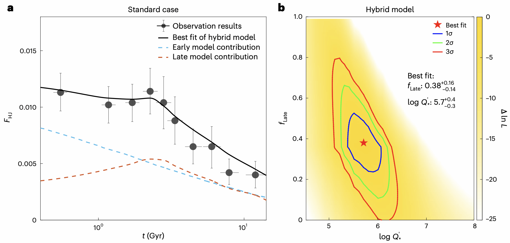 图3:基于热木星出现率-年龄规律(左)给出热木星通过“长期混沌”机制形成的比例(flate)和恒星潮汐因子(logQ)的定量约束(右)。