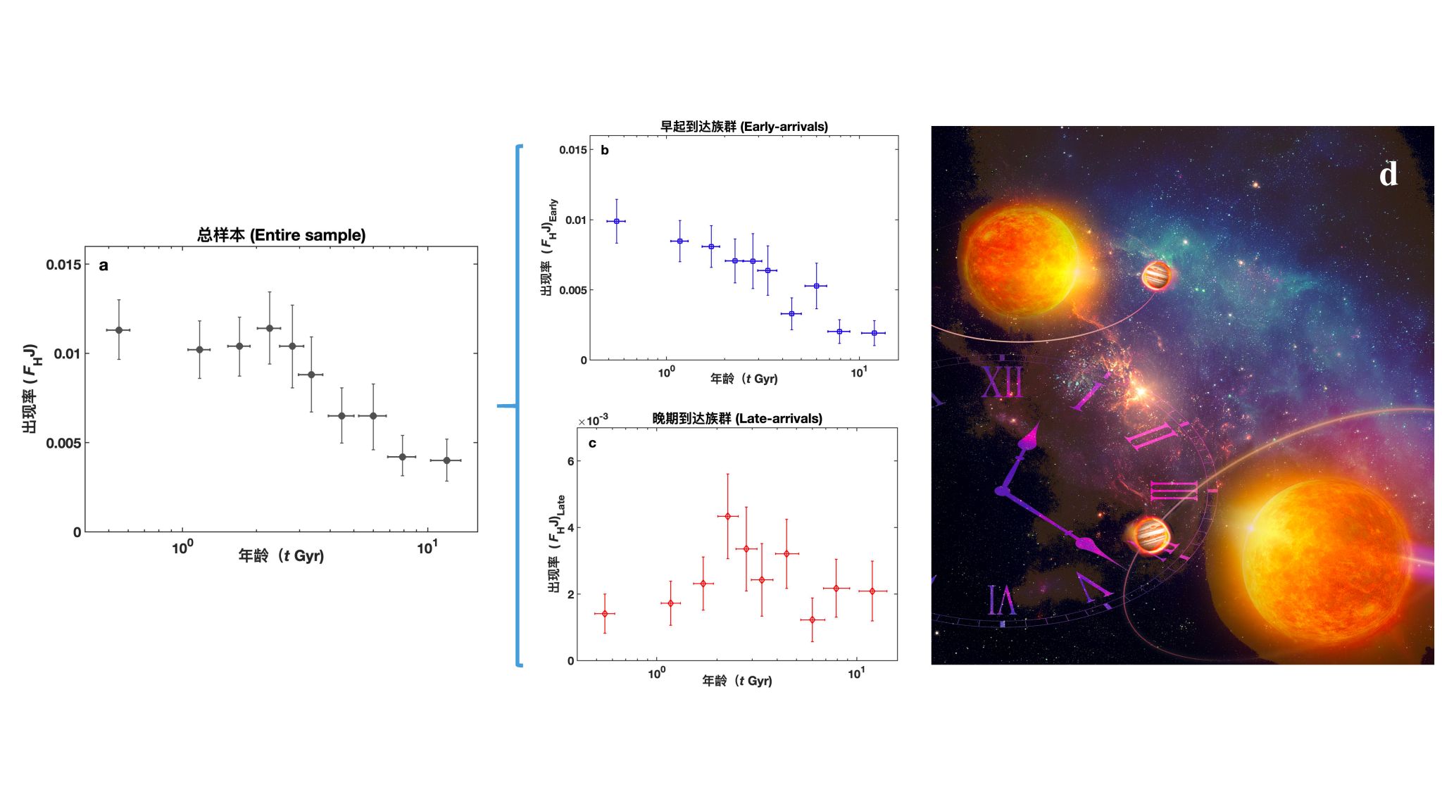 图2: 热木星出现率分段衰减与多机制形成。总样本(a) 和早期到达族群 (b)、晚期到达族群(c)的出现率-年龄演化规律。(d)为两个族群的轨道构型示意图。