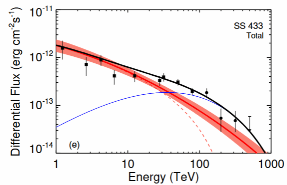 拉索的观测显示,黑洞-喷流系统的伽马射线能谱延伸至数百TeV甚至接近PeV,表明该系统是极端高效的粒子加速器。尤其值得注意的是,微类星体SS 433的辐射形态在100TeV之下与X射线波段观测到的形态吻合,表明其源于喷流与黑洞东西两侧的星际介质相互作用产生的瓣状结构加速的电子;而在100TeV之上,辐射形态产生了变化,在南北方向产生了延展,并与黑洞周边一团由原子氢组成的大质量云团位置重合(图1),强烈暗示SS 433的超高能伽马射线起源于由该系统加速的PeV质子与物质的强相互作用。而拉索对SS 433的能谱测量也显示出电子辐射与质子辐射共存的迹象(图2)。对另一颗微类星体V4641 Sgr,拉索探测到的最高能量光子达0.8 PeV的光子,且在其能谱上未见明显的截断,明确表明该天体可以把粒子加速到至少1PeV。
