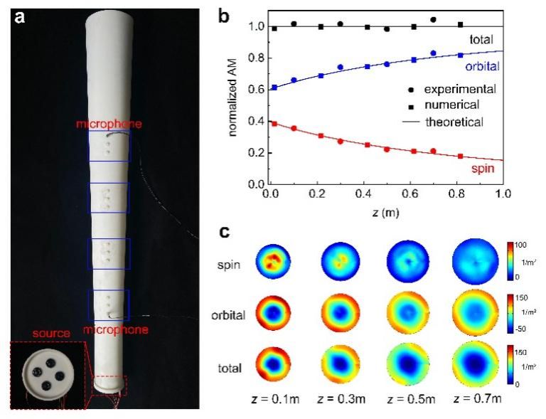 基于以上理论,课题组进一步提出了声波自旋与轨道角动量的定量调控策略。通过合理设置支持非耗散涡旋态传播的波导系统的边界条件和结构参数,实现了对声波自旋与轨道角动量的精确调控(图3)。此外,课题组还对声学系统中Abraham与Minkowski两种角动量定义进行了分析比较,发现了Minkowski 角动量始终守恒,使得在流体声学中实现全局自旋-轨道耦合成为可能。为了实现对该效应的实验观测,课题组提出了一种通过改变声束傍轴性来调控耦合强度的自旋-轨道耦合机制,并构建了对应的实验验证系统。仅需在缓变截面波导管中激发相应的涡旋模态,并在沿声束传播过程的不同横截面进行积分自旋和角动量的测量,即可实验观测到自旋角动量逐渐向轨道角动量转化的过程,从而严格验证了所提出的自旋-轨道耦合机制(图4)。