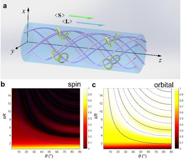 图1:(a)圆柱波导模态的自旋与轨道角动量示意图; (b)(c):当涡旋的量子数 l=+1时,归一化自旋与轨道角动量随近轴程度及波导半径的变化。