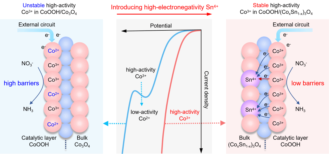 为揭示电化学硝酸根还原反应(NO3RR)过程中界面电子转移机制,课题组设计了一种CoOOH/(CoxSn1-x)3O4异质结催化剂。其原理在于:通过在Co3O4基底中掺入锡(Sn)元素形成(CoxSn1-x)3O4,增大了其与 CoOOH 催化层之间的功函差异,从而显著增强了异质结界面电场;这一强化的界面电场能够在负电压(还原电位)作用下稳定 CoOOH层中的低自旋 Co3+(t2g6eg0)活性中心。以此稳定、高效的催化活性中心,实现在高电流密度下NO3RR的持久高效催化,并服务于电子转移机制的深入研究。