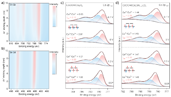 图4. 自旋态转变及活性中心的稳定性。CoOOH/(CoxSn1-x)3O4的a) Co 2p和b) Sn 3d XPS 深度剖析;c) CoOOH/Co3O4和d) CoOOH/(CoxSn1-x)3O4的Co 2p3/2芯能级的原位XPS谱。