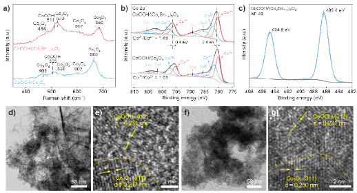 图2. CoOOH/Co3O4和CoOOH/(CoxSn1-x)3O4的结构表征。a) 拉曼光谱;b) Co 2p的XPS 光谱;c) Sn 3d的XPS谱;d)-e) CoOOH/Co3O4的高分辨透射电镜图;f)-g) CoOOH/(CoxSn1-x)3O4的高分辨透射电镜图。