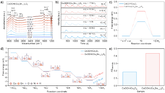 图6. CoOOH/Co3O4和CoOOH/(CoxSn1-x)3O4的电化学反应机制。a) 原位电化学ATR-SEIRAS光谱;b) 电化学在线质谱;c) 氢析出的反应自由能;d) 硝酸根还原反应的自由能;e) 硝酸根还原反应产物选择吉布斯自由能。