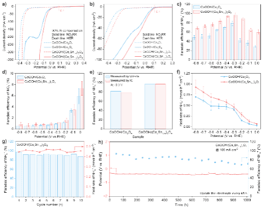 图3. CoOOH/Co3O4和CoOOH/(CoxSn1-x)3O4电催化NO3RR性能表征。a) LSV曲线;b) I-t拟合的LSV曲线;c)-d) NH4+和NO2-的法拉第效率;e) 不同方法测试NH4+法拉第效率对比;f) NH4+产率;g) 循环稳定性测试;h) 恒电流稳定性测试。
