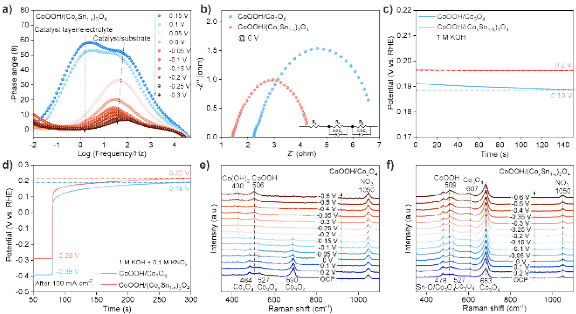 图5. 电子转移及活性中心指认。a) CoOOH/(CoxSn1-x)3O4的原位EIS Bode图;b) 在0 V 时的EIS Nyquist图;c) 开路电压测试;d) 在100 mA/cm2的电流下极化后的开路电压测试;e)CoOOH/Co3O4和f) CoOOH/(CoxSn1-x)3O4的原位拉曼光谱。
