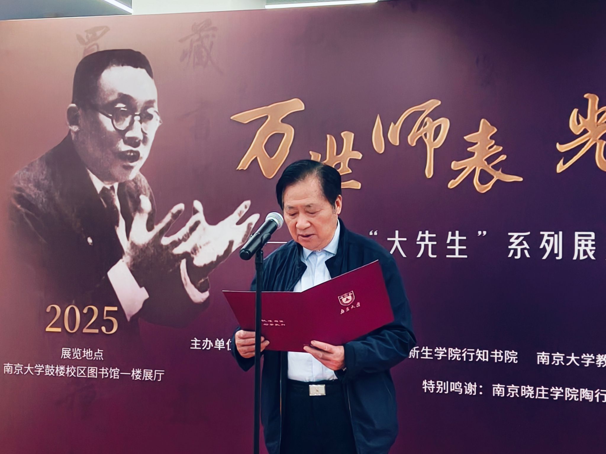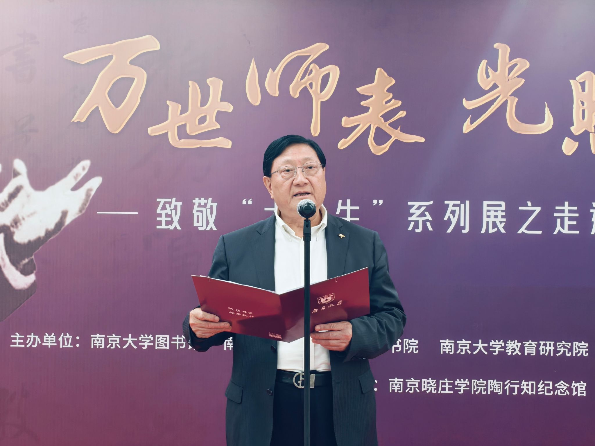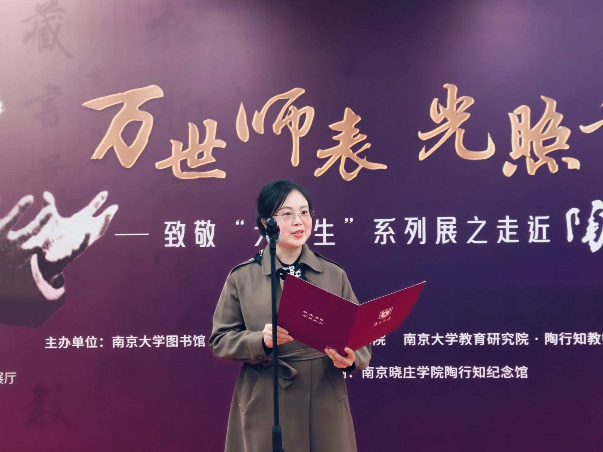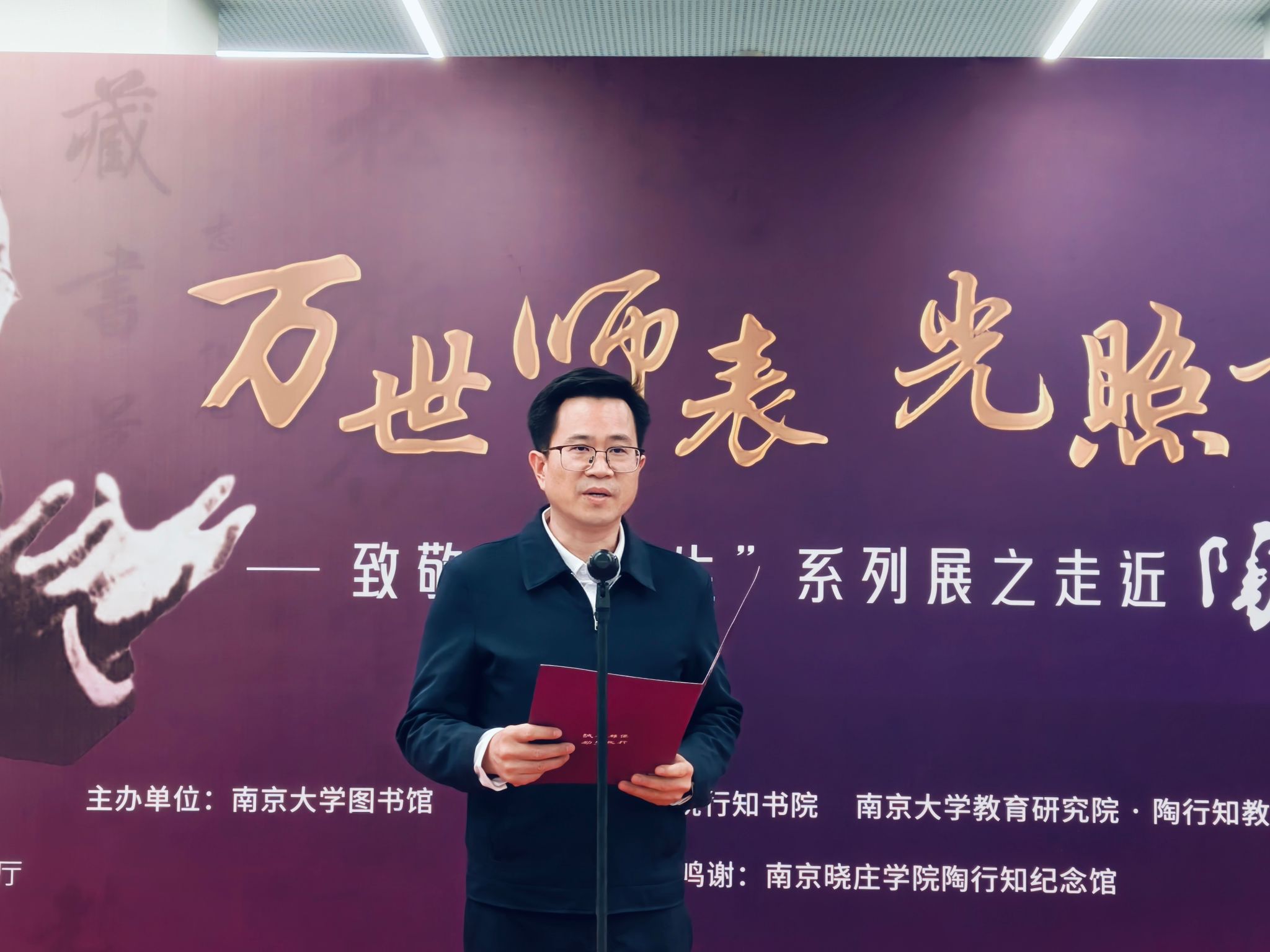 11月24日下午,“万世师表 光照千秋”——致敬“大先生”系列展之走近陶行知在大学鼓楼校区图书馆正式开展。大学原副校长、校关工委常务副主任闵铁军,大学人文社会科学资深教授、新生学院行知书院院长赵曙明,民盟江苏省委秘书长占飞富,晓庄学院陶行知研究院副院长赵娟等出席开幕式。行知书院师生代表及图书馆馆员,以及来自理工大学、农业大学、财经大学的盟员代表参加开幕式。开幕式由大学图书馆副馆长翟晓娟主持。