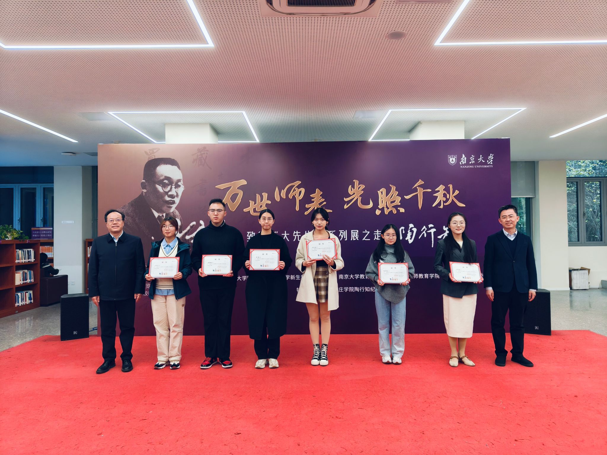 开幕式上,大学新生学院委书记施林淼、图书馆馆长黄贤金为行知精神宣讲团成员代表颁发了证书。闵铁军宣布致敬“大先生”系列展之走近陶行知开幕。行知书院师生与参加开幕式的嘉宾合影留念。