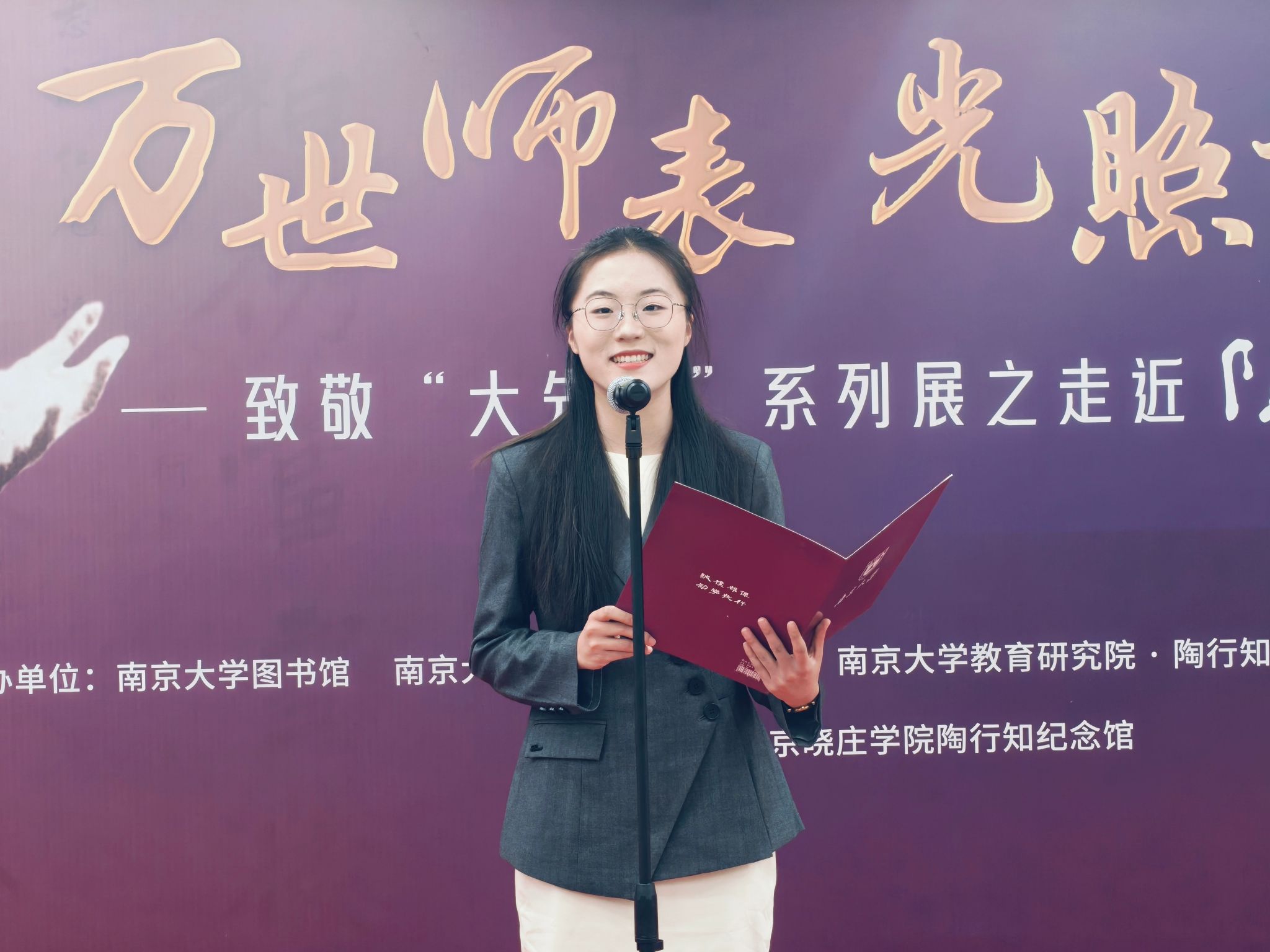 行知书院学生代表李佳翼表达了自己对陶行知先生的崇敬之情,她表示作为行知精神宣讲团的成员,既要在宣讲中把先生的精神讲活,在实践中把先生的理念做实,还要在传承中把先生的思想传远,要做扎根实践的躬行者,把论文写在祖国大地上,做坐言起行的实干家,用热血浇灌理想之花。