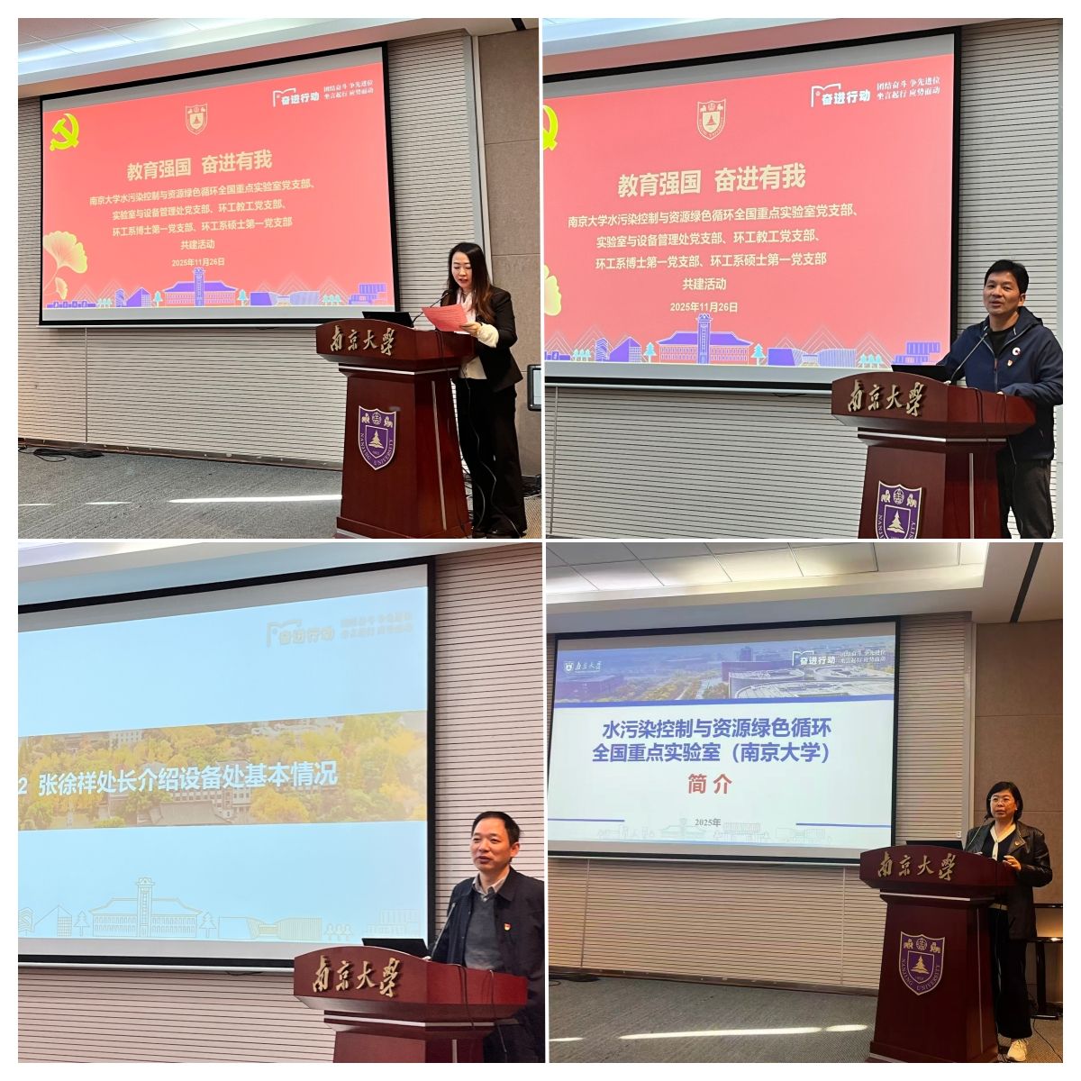 为深入学习贯彻的二十届四中全会精神,认真贯彻关于教育的重要论述和全国教育大会精神,引导员立报国强国大志向、做挺膺担当奋斗者,11月26日上午,大学环境学院水污染控制与资源绿色循环全国重点实验室支部、实验室与设备管理处支部、环工教工支部、环工系博士第一支部以及环工系硕士第一支部联合开展“教育强国 奋进有我”主题日活动。活动由重点实验室支部书记黄蕾主持。实验室与设备管理处处长、支部书记张徐祥,环境学院副院长、重点实验室主任潘丙才,环境学院副院长周庆,重点实验室副主任罗义以及环境工程系师生支部员共计线下50余人、线上100余人参加活动。
